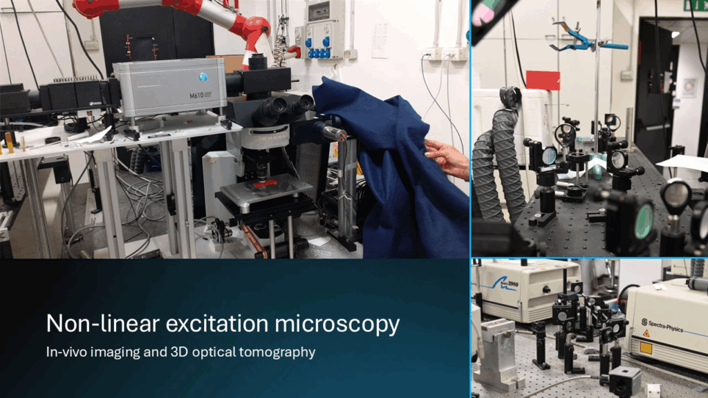 The facility is devoted to the investigation of the structure, function, and dynamics of biological systems through advanced non‑linear excitation microscopy. Its mission is to provide researchers with state‑of‑the‑art tools capable of probing living tissues, cellular architectures, and biomolecular processes with high spatial and temporal resolution. At the core of the laboratory is a direct raster‑scanning microscope designed for neurophysiology, which is coupled to two independent femtosecond laser sources. This dual‑laser configuration enables flexible excitation schemes and supports optical tomography of thick and highly scattering specimens, allowing users to explore biological samples well beyond the limits of conventional linear microscopy.