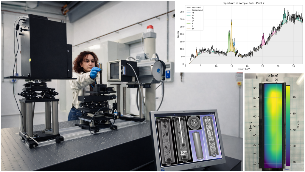 RETINA is routinely applied to quantitative/qualitative XRF on planar samples (materials screening, process control, failure analysis) and to 3D inspection of medium-sized objects (sealed battery cells, engineered parts, heterogeneous composites). Beyond energy materials, the facility supports applied elemental investigations such as chromium quantification in leather (compliance and conservation studies) and the elemental/metallic composition analysis of fossilized bones, where combined mapping and imaging help distinguish mineral phases, diagenetic alteration patterns and metal enrichment.